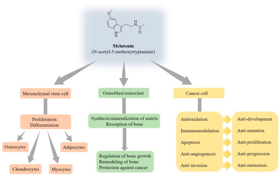 In addition to the regulation of the sleep cycle, endocrine system, reproductive cycle, bone metabolism, cell cycle, and mitochondrial function, melatonin influences bone growth and metabolism to promote the differentiation and mineralization of osteoblast cells grown [38]. Additionally, melatonin participates in the regulation of bone homeostasis via the modulation of osteoblast and osteoclast activities by receptor-independent and dependent pathways, and then bone remodeling is established by the synthesis of bone matrix by osteoblasts and the resorption of bone by osteoclasts [39]. Meanwhile, melatonin induces osteoblastic differentiation and mineralization for osteogenesis and bone formation through the bone morphogenetic protein (BMP)/ERK/Wnt signaling pathways [40].