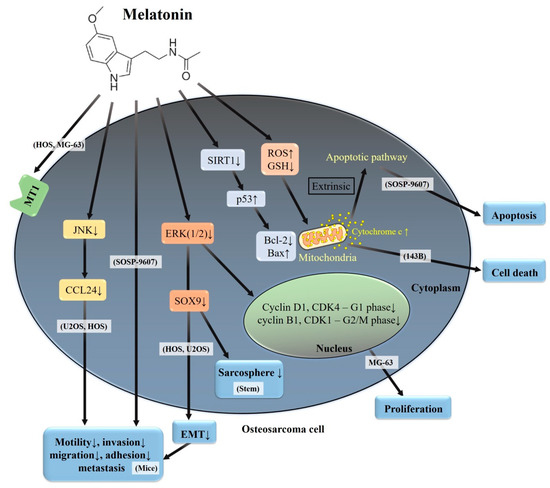 Through the downregulation of the expressions of cyclin D1 and CDK4 (related to G1 phase), as well as cyclin B1 and CDK1 (related to G2/M phase), melatonin inhibits the proliferation of human osteosarcoma MG-63 cells [65]; meanwhile, the inhibition of the ERK1/2 signaling pathway is involved in the melatonin’s anti-proliferative effect, induction of G1 and G2/M phase cell arrest, and downregulation of expressions of cyclin D1, CDK4, cyclin B1, and CDK1 in MG-63 cells [66]. Furthermore, melatonin affects the cellular redox status to create a substantial correlation between apoptosis and ROS generation in human osteosarcoma SOSP-9607 cells [67]. In addition to the alleviation of the adhesive and migratory abilities, melatonin induces apoptosis in SOSP-9607 cells via the down-regulation of sirtuin 1 (SIRT1, a conserved nicotinamide adenine dinucleotide-dependent deacetylase), which has an association with age and cancer [68], thus leading to increased p53 acetylation. Then, acetylated p53 triggers the intrinsic apoptotic pathway by decreasing Bcl-2 levels and increasing Bax and cytochrome c expressions.