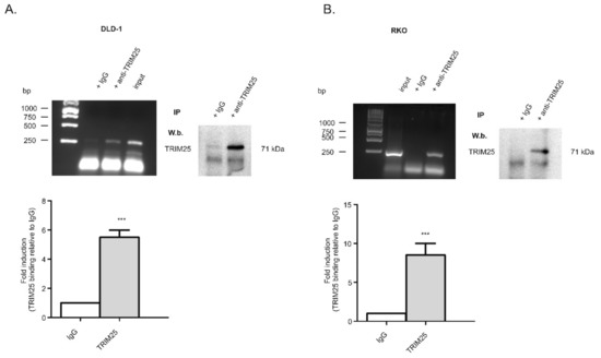 Figure 1. TRIM25 is a bona fide caspase-2 mRNA-binding protein in the human colon carcinoma cell line DLD-1 (A) and RKO (B). RNP-IP assays from total cell lysates of colon carcinoma cells were performed and followed by RT-PCR. TRIM25-bound mRNA was precipitated by the addition of monoclonal TRIM25-specific antibodies (anti-TRIM25) or, alternatively, the same amount of mouse IgG (IgG) as a negative control. RNA samples were analyzed by semiquantitative RT-PCR using primersets encompassing the coding region of caspase-2. The specific immunoprecipitation (IP) of TRIM25 in both cell lines was validated by Western blot analysis (W.b.) as shown on the right-hand side. Input levels of caspase-2 mRNA were monitored by RT-PCR (input). Graphs shown in the lower parts of the panels show means ± SD (n = 3) and depict the relative caspase-2 binding to TRIM25 (filled bars) in relation to IgG (open bars). *** p ≤ 0.001 vs. IgG.