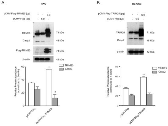 Figure 2. TRIM25 reduces abundance of caspase-2 protein in RKO cells but not in HEK cells. Subconfluent RKO (A) or HEK293 (B) cells mock transfected (-) or transfected with the indicated amount of Flag-tagged human TRIM25 (pCMV-Flag-TRIM25) or, alternatively, with the same amount of empty pCMV-Flag vector (pCMV-Flag). Then, 48 h after transfection, the amounts of endogenous and ectopic TRIM25 and caspase-2 were monitored by Western blot analysis and β-actin was used as a loading control. Graphs at the bottom show means ± SD (n = 3) and depict the relative abundance of TRIM25 (open bars) and caspase-2 (filled bars) protein in both transfected cell populations. ** p ≤ 0.005, *** p ≤ 0.001 (TRIM25), and # p ≤ 0.05 (Casp2), respectively, vs. empty vector transfected.