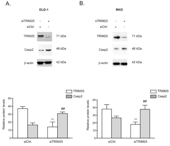 Figure 3. Silencing of TRIM25 increases caspase-2 protein levels in colon carcinoma cells. Subconfluent DLD-1 (A) or RKO (B) cells were transfected with control siRNA duplexes (siCtrl.) or with siRNA duplexes of TRIM25 (siTRIM25). Then, 48 h after transfection, cells were harvested and total protein lysates (20 µg) were subjected to SDS-PAGE. The abundance of TRIM25 and caspase-2 was analyzed by Western blot analysis and β-actin was used as a loading control. Graphs at the bottom show means ± SD (n = 3) and depict the relative protein levels of TRIM25 (open bars) and caspase-2 (filled bars) protein. ** p ≤ 0.005, (TRIM25) and ## p ≤ 0.005 (Casp2), respectively, vs. control siRNA-transfected (siCtrl.) cells.