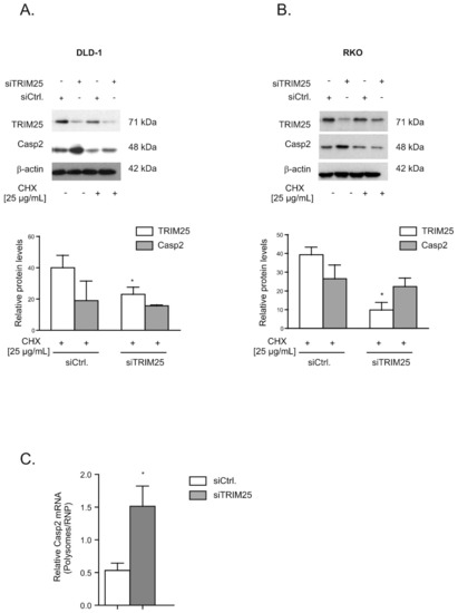 Figure 4. TRIM25 silencing-mediated increase in caspase-2 depends on de novo protein synthesis. Subconfluent DLD-1 (A) or RKO (B) cells were transfected with control siRNA duplexes (siCtrl.) or with siRNA duplexes of TRIM25 (siTRIM25) for 24 h before translation was blocked by the addition of cycloheximide (CHX, 25 µg/mL). After an additional 24 h, cells were harvested for total protein extraction. Total protein lysates (20 µg) were subjected to SDS-PAGE before the abundance of TRIM25 and caspase-2 was analyzed by Western blot analysis, with β-actin used as a loading control. Graphs at the bottom show means ± SD (n = 3) and depict the relative protein levels of TRIM25 (open bars) and caspase-2 (filled bars) protein at 24 h after CHX application. * p ≤ 0.05 (TRIM25) vs. control siRNA-transfected (siCtrl.) cells. (C). Subconfluent DLD-1 cells were transfected with control siRNA duplexes (siCtrl.) or with siRNA duplexes of TRIM25 (siTRIM25) for 48 h before fractions of translational inactive RNPs were separated from translational active polysomes by ultracentrifugation. The amount of caspase-2 mRNA was determined by qRT-PCR using primer pairs that were complementary and specific to the coding region of caspase-2. The graph shows means ± SD (n = 3) and depicts the amount of caspase-2 mRNA levels normalized to GAPDH mRNA in polysomes relative to those in RNP fractions from control siRNA- (open bars) and TRIM25 siRNA-transfected cells (filled bars). * p ≤ 0.05 (TRIM25) vs. control siRNA-transfected (siCtrl.) cells.