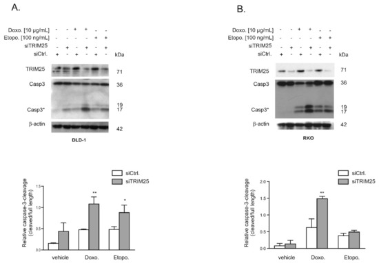 Figure 5. Knockdown of TRIM25 causes an increase in chemotherapeutic drug-induced intrinsic apoptosis in colon carcinoma cells. DLD-1 cells (A) or RKO cells (B) were either transfected with control siRNA (siCtrl.) or with siRNA duplexes against TRIM25 (siTRIM25) for 24 (A) or 48 (B) h before stimulation with doxorubicin (Doxo.) or etoposide (Etopo.) for a further 24 h. Thereafter, the cells were lysed for total protein extraction and caspase-3 cleavage and knockdown of TRIM25 were determined by Western blot, with β-actin used for equal loading. Graphs at the bottom summarize the densitometric analysis of cleaved caspase-3 (Casp3*) levels in relation to full-length caspase-3. Data show means ± SD (n = 3) * p ≤ 0.05, ** p ≤ 0.01 siTRIM25 (filled bars) vs. siCtrl. (open bars) transfected cells.
