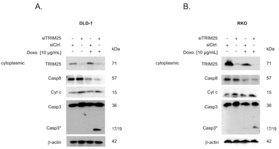 Figure 6. Silencing of TRIM25 via increased mitochondrial cytochrome c release leads to a sensitization of doxorubicin-induced caspase-3 cleavage. DLD-1 cells (A) or RKO cells (B) were transfected with control siRNA duplexes (siCtrl.) or with siRNA duplexes targeting TRIM25 (siTRIM25) for 48 h before being stimulated with the indicated doses of doxorubicin (Doxo.). After a further 24 h, cells were harvested for cytoplasmic cell lysates. The content of cytoplasmic cytochrome c (Cyt c), mature caspase-8, and cleavage of caspase-3 as well as the knockdown efficiency of TRIM25 was subsequently determined by Western blot using β-actin as a loading control. Data are representative of two independent experiments giving similar results.