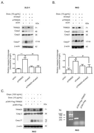 Figure 7. Silencing of caspase-2 prevents doxorubicin-induced apoptosis upon TRIM25 knockdown. DLD-1 (A) or RKO (B) cells were transfected with control siRNA (siCtrl.) or with siRNA duplexes either targeting caspase-2 (siCasp2) or TRIM25 (siTRIM25) or, alternatively, simultaneously transfected with TRIM25 plus caspase-2-specific siRNAs for 24 (A) or 48 (B) h before cells were exposed to doxorubicin for a further 24 h. Thereafter, cells were collected for total protein extraction and activation of caspase-3 cleavage and knockdown efficiency of TRIM25 or caspase-2 determined by Western blot using β-actin as a control for equal protein loading. Graphs summarize a densitometric analysis of cleaved caspase-3 (Casp3*) levels in relation to full-length caspase-3. Values show means ± SD (n = 3) *** p ≤ 0.005 siTRIM25 vs. siCtrl. and # p ≤ 0.05, ## p ≤ 0.01 siTRIM25/Casp2 vs. siTRIM25. (C, left panel). Subconfluent RKO cells were transfected for 48 h with 6 µg of Flag-tagged human TRIM25 (pCMV-Flag-Trim25) or, alternatively, with the same amount of empty pCMV-Flag vector (pCMV-Flag) before being treated with either the vehicle (-) or with the indicated chemotherapeutic drugs. After a further 24 h, cells were harvested for total protein extraction and the cleavage of caspase-3 as well as the overexpression of TRIM25 was determined by Western blot using β-actin as a loading control. (C, right panel). RNP-IP assays from total cell lysates of RKO cells expressing either Flag-tagged human TRIM25 (pCMV-Flag-TRIM25) or pCMV-Flag (pCMV-Flag). TRIM25-bound mRNA was isolated by the use of anti-Flag-M2 magnetic beads followed by RT-PCR. For PCR, primer pairs, complementary and specific to the coding region of caspase-2, were used and the length of specific PCR products determined by a DNA ladder. Data shown are representative of three independent experiments giving similar results.