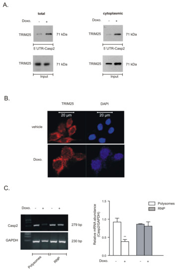 Figure 8. Doxorubicin induces TRIM25 binding to the 5′UTR of caspase-2 and reduces recruitment of caspase-2 mRNA at polysomes. (A). Representative biotin pull-down assays showing doxorubicin-induced TRIM25 affinity to the 5′UTR of caspase-2. The biotinylated transcript, which encompasses 241 nucleotides of the 5′UTR of the human caspase-2 (5′UTR-Casp2), was incubated with either total (left) or cytoplasmic (right) cell lysates from vehicle-treated DLD-1 cells (−) or from cells treated with 10 µg/mL of doxorubicin (+) for 6 h. RNA binding of TRIM25 to the pull-down material was assessed by Western blot analysis and an equal input TRIM25 levels were assayed by Western blot analysis (input). Blots shown are representative of two independent experiments with similar results. (B). DLD-1 cells were stimulated for 6 h with either vehicle or with 10 µg/mL doxorubicin (Doxo.) before intracellular TRIM25 was analyzed by confocal microscopy. Cell nuclei were visualized by DAPI staining (blue panel). Bar: 20 µm. (C). DLD-1 cells were stimulated for 6 h either with vehicle (−) or doxorubicin (+) before fractions of translational inactive RNPs were separated from translational active polysomes by ultracentrifugation. The amount of caspase-2 mRNA and GAPDH mRNA was determined by semiquantitative RT-PCR using primer pairs that were complementary and specific to the coding region of both genes The graph on the right panel shows means ± SD (n = 3) and depicts the amount of caspase-2 mRNA levels normalized to GAPDH mRNA in polysomes (open bars) relative to those in RNP (grey bars) fractions. ** p ≤ 0.01, doxorubicin vs. vehicle-treated cells.