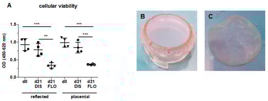 Cellular viability of reflected and placental amnion in fresh biopsies (day 0), biopsies mounted on CellCrown™ inserts (DIS), and biopsies kept floating (FLO) under common cell culture conditions for 21 days (A). Viability was measured with the EZ4U assay. Mean ± standard deviation (SD), n = 4 (donors). Samples of human amniotic membrane distended on CellCrown™ inserts (in 6 well plates) (B), and non-distended (“floating”) (C) at day 0. DIS: distended biopsies; FLO: floating biopsies; OD: optical density. **p < 0.01, ***p < 0.001.