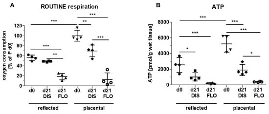 Since mitochondrial membrane potential does not necessarily reflect mitochondrial activity, we determined mitochondrial ROUTINE respiration, a measure for total mitochondrial oxygen consumption. In fresh biopsies (day 0), significantly higher ROUTINE respiration was detected in placental compared to reflected amnion (Figure 3A). This is in line with a previous publication of our group [18]. No difference was observed between day 0 and distended reflected amnion at day 21. Placental amnion biopsies showed an approximately 30% lower ROUTINE respiration at day 21 compared to day 0. This is insofar interesting, as it has been shown that regarding mitochondrial activity, placental amnion is also much more responsive to changes in the microenvironment compared to reflected amnion [29]. In that study, responsiveness of placental amnion to inhibition of ATP synthase was much more pronounced. Furthermore, human amniotic mesenchymal stromal cells of placental amnion were found to be more susceptible to changes in oxygen tension [30]. As expected, ROUTINE respiration of both regions (reflected and placental) dramatically decreased in floating biopsies after 21 days compared to day 0. ROUTINE respiration was also significantly lower in floating compared to distended biopsies in reflected amnion. This effect was again even more pronounced in placental amnion (Figure 3A). The reasons for the repeatedly observed differences between reflected and placental amnion are still not known. We believe that the different anatomical locations of the hAM (one covering the placenta, the other opposite it) influence its properties. It is likely that during pregnancy, the two different amniotic sub-regions have different biological functions. Of note, regarding mechanical forces, the rupture of membranes at term takes place in the zone of altered morphology, an area within the reflected amnion [31].