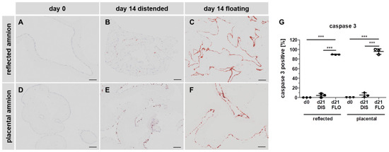 We first subjected paraffin-embedded hAM biopsies to immunohistochemistry staining with anti-cleaved caspase 3 antibodies. As expected, in fresh biopsies (day 0), no caspase 3 positive cells were detected in either amniotic region (Figure 4A,D,G). After 14 days, in distended biopsies, scattered expression of caspase 3 was found in reflected (Figure 4B,G) and placental samples (Figure 4E,G). In contrast, in floating biopsies, expression of caspase 3 drastically increased in both regions (Figure 4C,F,G), compared to fresh biopsies (Figure 4A,D,G), and distended biopsies (Figure 4B,E,G), indicating the occurrence of apoptotic cell death [34].