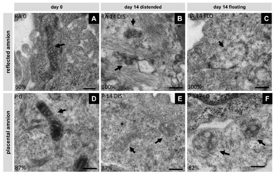 Changes in mitochondrial morphology were analyzed with transmission electron microscopy (Tecnai 20, FEI Europe, Eindhoven, Netherlands) in reflected (RA) (A,B,C) and placental (P) (D,E,F) amnion at day 0 (A,D) and at day 14 in biopsies cultivated while mechanically stretched (B,E) or kept floating (C,F), n = 2 (donors). Scale bar: 200 nm. Arrows indicate mitochondria. DIS: distended biopsies; FLO: floating biopsies.