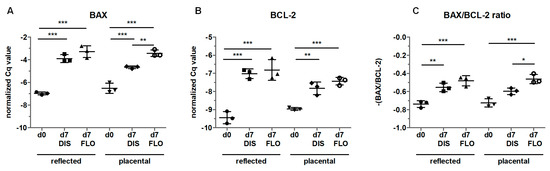 Gene expression of B-cell lymphoma 2-associated X protein (BAX) (A) and B-cell lymphoma (BCL)-2 (B) was determined by qPCR in fresh biopsies (day 0) and at day 7 in biopsies cultivated while mechanically stretched (DIS) or kept floating (FLO) in reflected and placental amnion. The results were normalized on the geometric mean of 4 different reference genes. The BAX/BCL-2 ratio is shown in (C). Mean ± SD, n = 3 (donors). DIS: distended biopsies; FLO: floating biopsies; Cq value: cycle of quantification value. Level of significance is indicated as *p < 0.05, **p < 0.01, ***p < 0.001.