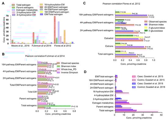Figure 2. (A) Relative circulatory levels of parent estrogens and its metabolites in different cohorts (data obtained from respective studies as indicated). (B) Correlation of systemic estrogen and estrogen metabolites microbiome diversity (analyses of data published by Fuhrman et al., 2014). (C) Correlation of systemic estrogen and estrogen metabolites microbiome diversity (analyses of data published by Flores et al., 2012). (D) Comparison of relative circulatory levels of parent estrogens and its metabolites in two different cohorts (Data obtained from respective studies).