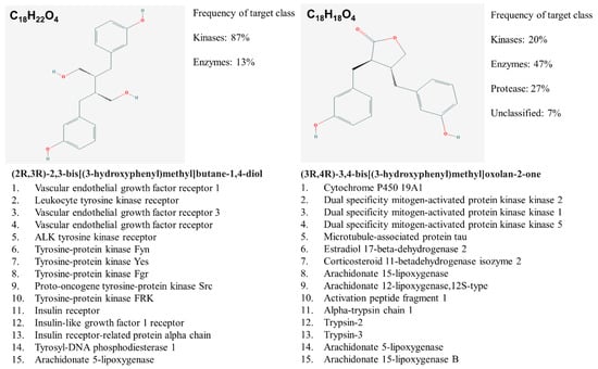 In silico target prediction using SwissDock target scan suggested that the enterolignans can act as ligands to multiple targets including kinases and their receptors in addition to estrogen receptors (ERs) (Figure 4).