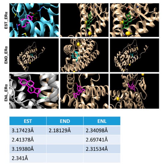 Molecular docking using AutoDock Vina and UCSF Chimera showed that both END and ENL can bind to ERα and ERβ similar to estrogen (E2) (Figure 5). Next, we examined the effect of END and ENL treatment on cell viability, anchorage-dependent and anchorage-independent growth of breast cancer cells. END and ENL treatment induced cell proliferation in ER positive breast cancer cell lines, MCF7, BT474, and T47D (Figure 6A–C). Interestingly, growth stimulatory effect of END and ENL was apparent in the absence of estrogen (Figure 6A–C) whereas moderate inhibition was observed when END and ENL were used in combination with 100 nM E2 (Figure 6D,E) suggesting that competition for the ligand binding site in the presence of E2 negates their estrogenic activity. END and ENL treatment stimulated clonogenicity and soft-agar colony formation of breast cancer cells (Figure 6F,G). These results showed that breast cancer cells treated with END and ENL exhibit increased cell viability and clonogenic potential. Estrogen binds to estrogen receptor starting a cascade of signaling events resulting in an increased expression of E2-responsive genes.