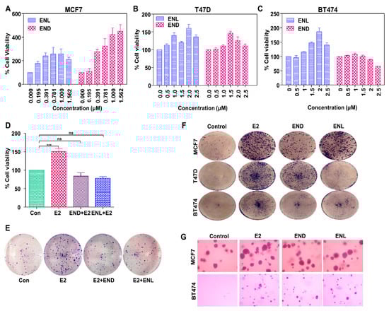 Figure 6. Enterodiol (END) and enterolactone (ENL) enhance proliferation and colony formation in ER positive breast cancer cell lines. (AC) MCF7, T47D, and BT474 cells were treated with various doses of END and ENL followed by MTT assay. (D,E) MCF7 cells were treated with 1 μM END and 1 μM ENL in the presence of 100 nM E2 followed by MTT and clonogenicity assay. (F,G) BT474, T47D and MCF7 cells were treated with 1 μM END, 1 μM ENL and 100 nM E2 followed by anchorage-independent as well as anchorage-dependent assays.*** p < 0.0005; ns p > 0.05.