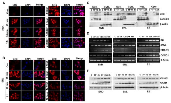 Figure 7. END and ENL induce nuclear translocation of estrogen receptor (ER) and increase the expression of ER-responsive genes. (A,B) MCF7 cells were treated with 1 μM END and 1 μM ENL for different time intervals as indicated and localization of ER was examined using immunocytochemistry. (C) MCF7 cells were treated with 1 μM END, 1 μM ENL, and 100 nM E2 followed by nuclear and cytoplasmic extraction and immunoblot analyses for ER expression. (D,E) MCF7 cells were treated with 1 μM END, 1 μM ENL, and 100 nM E2 for indicated time intervals. Protein lysates and total RNA were isolated and examined for the expression of ER-responsive genes as noted.