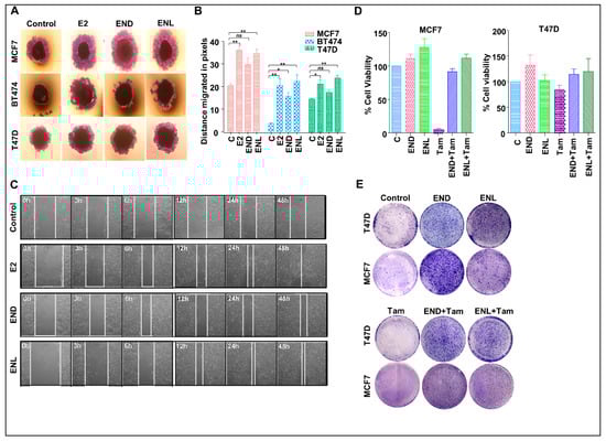 To test the effect of END and ENL on the migration potential of breast cancer cells, we performed wound healing and spheroid migration assays (Figure 8A–C). Migration from MCF7, T47D and BT474 spheroids was significantly increased upon ENL treatment while END treatment only induced significant migration of BT474 cells (Figure 8A,B). While control MCF7 cells migrated at a rate of 0.52 pixcels/h, END induced 1.1875 pixcels/h migration while ENL resulted in 1.56 pixcels/h migration. The positive controls, E2 treated cells migrated at a rate of 1.45 pixcels/h (Figure 8B). Next, we sought to investigate whether END and/or ENL impact tamoxifen-mediated growth inhibition of breast cancer cells. Tamoxifen treatment inhibited cell viability and clonogenic growth of ER-positive breast cancer cells but cotreatment with END and ENL compromised the cytotoxicity of tamoxifen in MCF7 and T47D cell lines (Figure 8D,E). Collectively, these data suggest that END and ENL bind to ER and modulate ER-signaling cascade and increase breast cancer growth. END and ENL also interfere with the therapeutic efficacy of tamoxifen.