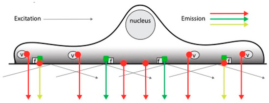 Hypothetical model illustrating patterns of TIRF emission depending on the co-localization between probe A (red) and probe B (green) having different subcellular localizations with limited overlap. The shaded gray area indicates the TIRF zone. v indicates intracellular vesicles and f focal adhesions. Depending on the stimulus/conditions, the yellow signal (co-localization) will vary.