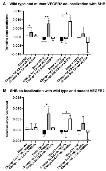 When analyzing actual TIRF recordings, VEGFR2 exhibited an increased rate of co-localization with SHB during the first 2.5 min of VEGFA addition, an effect that was not detected during the subsequent 2.5 min (Figure 2A). The same pattern after stimulation was also detected in cells expressing the Y951F mutant, although this mutant demonstrated a significant decrease in the rate of VEGFR2 co-localization with SHB during basal conditions, i.e., prior to VEGFA stimulation. The Y1175F mutant, on the other hand, showed a delay in its co-localization with SHB, only becoming apparent subsequent to the initial 2.5 min of stimulation. The Y1214F VEGFR2 mutant displayed no significant differences in association rates although the pattern during the basal and early stimulation periods resembled that of the wild type receptor.