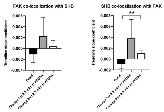 SHB and FAK co-localization by TIRF microscopy in lung endothelial cells (EC). Isolated primary EC growing on fibronectin-coated coverslips were transfected with eGFP-SHB and mCherry-FAK. Trendlines/slopes of co-localization were determined as in Figure 2 with basal (unstimulated) and VEGFA-stimulated values that were separated into the first and second 2.5-min periods after stimulation. Means ± SEM for six observations from four transfection experiments are given. ** indicates s p < 0.01 obtained from a Student’s t-test when compared with the basal value.