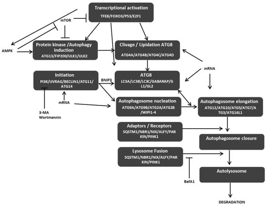 Interconnection of major autophagy steps. Autophagy induction and initiation of autophagy steps lead both to the cleavage and lipidation of autophagy gene 8 (ATG8) and autophagosome nucleation. ATG8 and protein involved in autophagosome elongation favor the closure of autophagosome and, then, its fusion with lysosome to form an autolysosome and to induce the degradation of its content. AMPK acts as an activator of autophagy, whereas mTOR acts as an inhibitor of autophagy. 3-MA and wortmannin are chemical inhibitors of early steps autophagy, whereas BafA1 blocks the fusion of autophagosomes with lysosomes. Arrows represent a positive action on the target, whereas bar-headed arrows represent an inhibition process.