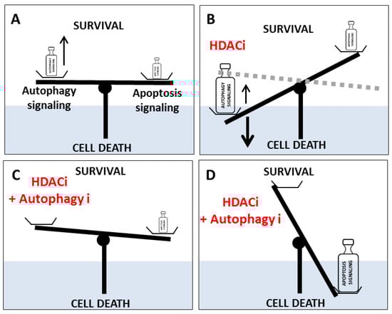 Model of the balance between autophagy and apoptosis governing cell death. (A) In cancer cells, the combination of an autophagy-mediated pro-survival signal and weak apoptosis led to cancer cell survival. (B) An HDACi can promote a slight increase in apoptosis signaling but also a strong increase in autophagy signaling leading to a balance in favor of autophagy-linked cell death (solid line) or survival (dotted line) depending of both cancer cell model and autophagy induction level. (C) The combination of an HDACi and an autophagy inhibitor (autophagy i) in cells resistant to apoptosis, or in the absence of an external signal of apoptosis, led to a balance in favor of survival via the inhibition of autophagy-linked cell death. (D) The combination of an HDACi and an autophagy inhibitor (autophagy i) led to a balance in favor of apoptosis.