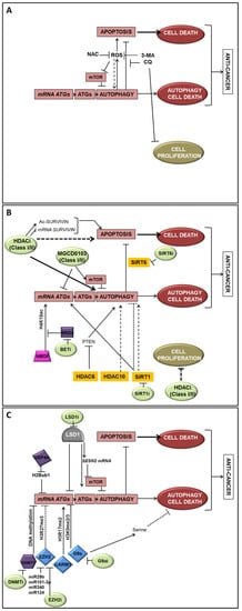 ACSS2 (Acyl-CoA Synthetase-2), AKT (AKT Serine/Threonine Kinase 1), AMBRA1 (Autophagy And Beclin 1 Regulator 1), AMPK (AMP-activated protein kinase), ASC (Se-allylselenocysteine), ATG (autophagy-related), ATG4 (Autophagy-related 4), AVO (acidic vesicular organelles), 5-azadC (5-aza-deoxycytidine), BafA1 (bafilomycin-1), BET (Bromodomain and extraterminal domain) inhibitors, BMI1 (BMI1 Proto-Oncogene, Polycomb Ring Finger), BCL2L10 (Bcl-2-Like Protein 10), BNIP3 (BCL2/adenovirus E1B 19 kDa protein-interacting protein 3), CARM1 (coactivator-associated arginine methyltransferase 1), CerS6 (Ceramide Synthase 6), ChIP (chromatin immune-precipitation), CQ (chloroquine), CTSA (coding cathepsin A), DNMT (DNA methyl transferase), E2F (E2F Transcription Factor), EGFR (Epidermal Growth Factor Receptor), ER (estrogen receptor), EZH2 (enhancer of zeste 2 polycomb repressive complex 2 subunit), GBA (β-glucuronidase), GUSB (β-glucosidase), HDAC (histone deacetylase), HDM (histone demethylase), HMGCR (3-Hydroxy-3-Methylglutaryl-CoA Reductase), HMT (histone methyltransferase) HR23B (RAD23 (S. Cerevisiae) Homolog B), FIH1 (Factor Inhibiting HIF1), 5-FU (5-Fluorouracil), GL1 (GABARAPL1, GABA Type A Receptor Associated Protein Like 1), H3 (Histone 3), HCC (hepatocellular carcinoma), HCQ (hydroxychloroquine), HIF-1α (hypoxia-inducible factor 1), JMD (Jumonji Domain Containing), KDM (Lysine Demethylase), LAMP1 (lysosomal membrane protein 1), LAPTM5 gene (Lysosomal-associated protein multispanning transmembrane 5), (loss of heterozygosity), LSD1 (Lysine-specific demethylase-1), 3-MA (3-methyl-adenine), MAP1LC3v1 (Microtubule Associated Protein 1 Light Chain 3 Alpha), MTOR (Mechanistic Target Of Rapamycin), NAC (N-acetyl cysteine), NFKB (Nuclear Factor Kappa B Subunit), NSCLC (non-small cell lung carcinoma), PARP (Poly(ADP-Ribose) Polymerase 1), PCAF (p300/CBP-associated factor), PCDH17 (Protocadherin 17), PKM2 (Pyruvate kinase M2), PTEN (Phosphatase And Tensin Homolog), ROS (Reactive Oxygen Species), SAHA (suberanilohydroxamic acid), SIRT (Sirtuin), SP1 (Sp1 Transcription Factor), SQSTM1 (Sequestosome 1), STAT1 (Signal Transducer And Activator Of Transcription 1), TDP-43 (TAR DNA Binding Protein), TIGAR (TP53-induced glycolysis and apoptosis regulator), TKI (Tyrosine kinase inhibitor), TNBC (triple negative BC), TSA (trichostatin A), TSS (transcriptional start site), TSG (tumor suppressor genes), USP44 (Ubiquitin Specific Peptidase 44), ULK (Unc-51 Like Autophagy Activating Kinase), UVRAG (ultraviolet irradiation resistance-associated), VPA (valproic acid).