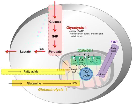 The most used nutrient is glucose. Glycolysis converts glucose into pyruvate in the cytoplasm. Under normoxic conditions, pyruvate is transformed into acetyl-CoA in the mitochondria, by oxidative decarboxylation. Acetyl-CoA enters the tricarboxylic acid (TCA) cycle and is oxidized into CO2, permitting the reduction of (i) nicotinamide adenine nucleotide (NAD) into NADH and/or (ii) flavin adenine dinucleotide into FADH2. These two redox cofactors can be used by the electron transport chain (ETC) for oxidative phosphorylation (OXPHOS), to create a proton gradient strong enough to permit the phosphorylation of ADP into ATP by the ATP synthase. The ETC is the most efficient way to produce energy for cell metabolism. Indeed, OXPHOS produces 36 molecules of ATP from one molecule of glucose [4]. Cells can metabolize other substrates, such as glutamine via glutaminolysis or fatty acids in β-oxidation, to replenish the TCA cycle and OXPHOS.