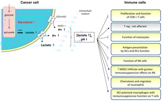 Cancer cells induced-lactate and -proton release within the peritumoral environment and the consequences for immune cell function. The metabolic switch towards aerobic glycolysis observed in most cancer cells (i.e., Warburg’s effect) produces significant amounts of pyruvate that are mostly metabolized into lactate. The intracellular increase of lactate, potentially toxic for the cancer cell, is then released into the extracellular medium together with protons (thanks to transporters such as MCT4), inducing an acidification of the local environment. The frequent up-regulation of carbonic anhydrase IX (CA-IX) in cancer cells also contributes to the local increase of H+ in the immediate neighborhood of cancer cells. Both, the accumulation of lactate and the decrease in the pH of the extracellular milieu create a detrimental environment for the antitumoral immune response, (i) decreasing the function of the CD8+ T cells, dendritic cells (DCs), monocytes, natural killer (NK) cells and/or (ii) increasing the myeloid-derived suppressor cells (MDSC) infiltrate or M2-polarized macrophages with greater immunosuppressive functions on NKs and T cells, respectively.