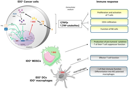 IDO can be overexpressed either in tumor cells or in tumor-associated cells such as dendritic cells, macrophages, or endothelial cells (Figure 3). Indeed, its overexpression leads to tryptophan deprivation, which can impair the immune cell functions, creating a de novo local tolerance, due to the anti-inflammatory effect [93]. IDO1 overexpression in tumor cells also leads to reduced plasmatic amounts of tryptophan, meaning that the immunosuppressive effect of IDO1 is not locally restricted but is systemic [94].