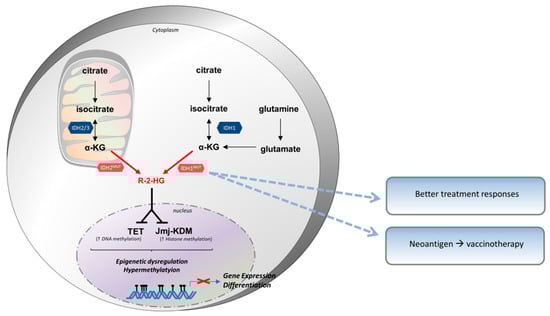 Isocitrate dehydrogenase (IDH) mutations in cancer cells and their clinical impact. Wild-type IDH1 (cytosol) and IDH2/3 (mitochondria) catabolize the oxidative decarboxylation of isocitrate into α-ketoglutarate (α-KG). This reaction generates CO2 and replenishes NADPH pools in the cell. IDH mutants (IDHMUT) display a reduced affinity for their natural substrate, while gaining neomorphic activity to convert α-KG into R-2-hydroxyglutarate (R-2-HG). R-2-HG is an oncometabolite that plays a key role in tumor progression. It is usually kept at low levels as it is re-converted into α-KG by dehydrogenases. In IDH mutated cancer cells, these dehydrogenases are overwhelmed by mutant activity, generating very high levels of R-2-HG. R-2-HG principally acts by binding to 2-OG-dependent dioxygenases, such as TET (TET methylcytosine dioxygenase) and Jmj-KDM (Jumonji C domain histone lysine demethylase) proteins. The binding to TET and KDM inhibits activity, increasing DNA and histone methylation patterns, respectively, and, thereby, altering gene expression patterns and cell differentiation. Patients with IDHMUT tumors seem to respond better to treatment. Moreover, this mutation leads to the expression of a neoantigen that can be a target for vaccinotherapy.