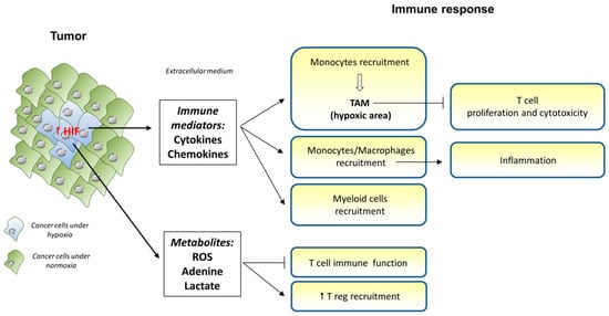 Hypoxia contributes to the recruitment of myeloid cells from bone marrow. Indeed, HIF-1α induces the production of chemokines and the expression of their receptors [202], including CCL5 or CXCL12 [201,203]. Furthermore, HIF-1α induces the expression and secretion of soluble molecules such as VEGF, which, besides their proangiogenic role, have a chemoattractant function for myeloid cells [204], or endothelins by tumor cells [205].