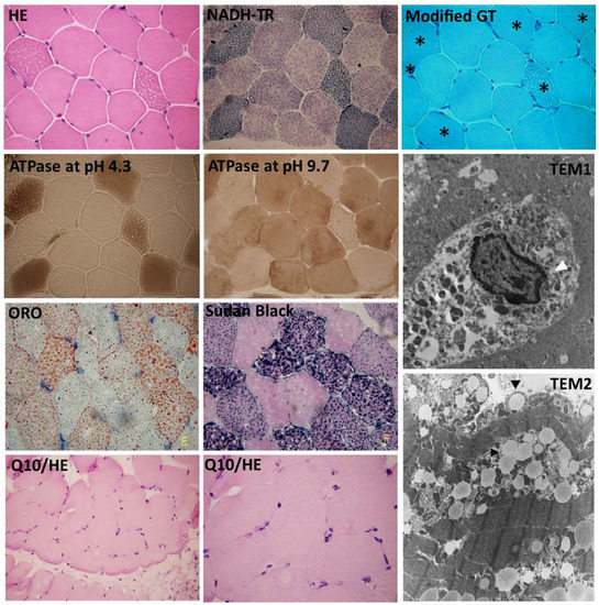 Histological and histochemical findings in muscle biopsies from the MADD patient 1. From left to right: muscle-specific staining with hematoxylin and eosin (HE) stain for myofibril morphology; Nicotinamide adenine dinucleotide (NADH)-tetrazolium reductase (NADH-TR) stain for respiratory complex I enzyme activity and the intermyofibrillar network; Modified Gomori Trichrome stain for demonstrating the intermyofibrillar network and detecting ragged fibers in mitochondrial myopathy; ATPase at pH 4.3, ATPase at pH 9.7 for differentiating type 1 and type 2 myofibers; Oil red O (ORO) for neutral lipids, and Sudan Black for neutral triglycerides and lipids. Stars indicate the affected muscle fibers with vacuolar myopathy in the serial muscle sections. Histochemical staining showed vacuolar myopathy and lipid droplet accumulation in type I muscle sections from MADD patient 1. Transmission electron microscopy (TEM1 and TEM2) images of the muscle ultrastructure are shown. White arrowhead indicates necrotic nucleus; black arrowheads indicate lipid droplets in the sarcolemma of MADD patient 1. Coenzyme Q10 (Q10) therapy has been shown to attenuate vacuolar myopathy in the Q10/HE muscle section.