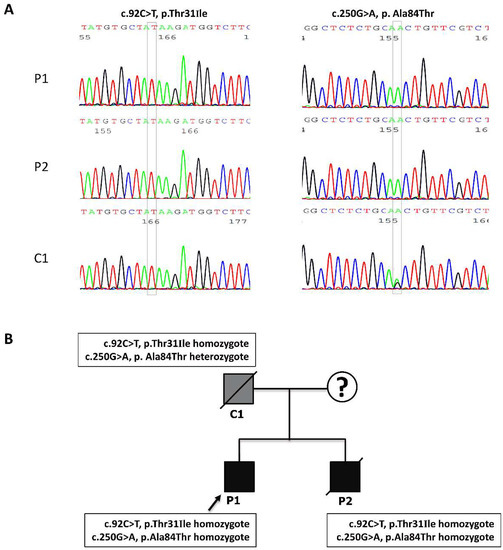 3.3. The Identification of the c.92C>T and c.250G>A Mutations in the Affected MADD Patients