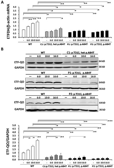 The four lymphoblastoid cell lines (normal control (WT), C1, P1, and P2) were treated with 400 μM of palmitic (C16:0), capric (C10:0), or hexanoic (C6:0) acid for 18 hours. In response to treatments with fatty acids, the expression levels of ETFDH mRNA were significantly increased (0.8-fold) in WT cells compared with untreated WT cells (Figure 3A). Lower expression levels of ETFDH mRNA were found in P1 and P2 cells with or without various fatty acid treatments (Figure 3A). We performed western blotting to detect the ETF-QO protein levels in the carrier and affected patients. A band size of 64 kDa was observed. Remarkable 1.7-fold and 2.6-fold increases of ETF-QO protein levels were detected in the capric acid- and palmitic acid-treated WT cells, respectively, compared to untreated WT cells. P1 and P2 cells showed a significant decrease in ETF-QO protein with or without various fatty acid treatments compared to WT cells (Figure 3B).