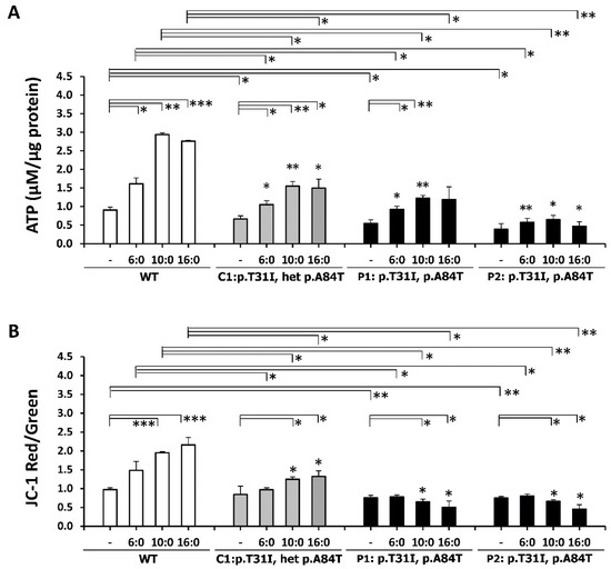 We established four lymphoblastoid cell lines from P1, P2, a normal control (wild type, WT), and the Family I-1 (carrier 1, C1). Epstein-Barr virus-transformed lymphoblastoid cell lines from all participants were generated by the Food Industry Research and Development Institute (BCRC, Hsinchu, Taiwan). The cell lines were maintained and grown at 37 °C and a humidified 5% CO2 in RPMI 1640 medium supplemented with 15% fetal calf serum (FCS, GIBCO, Grand Island, NY, USA), 1 mM pyruvate, 50 μg/mL uridine, 100 unit/mL of penicillin, and 0.1 mg/mL of streptomycin. The lymphoblastoid cells were challenged with palmitic (C16:0), capric (C10:0) or hexanoic (C6:0) acid. The concentrations of fatty acids used varied from 0.1 to 1.0 mM Palmitic acid was conjugated to fatty acid-free bovine serum albumin (BSA). The cells were cultured with the BSA-conjugated palmitic, capric, or hexanoic acid at 37 °C and 5% CO2 for 24 h [11].