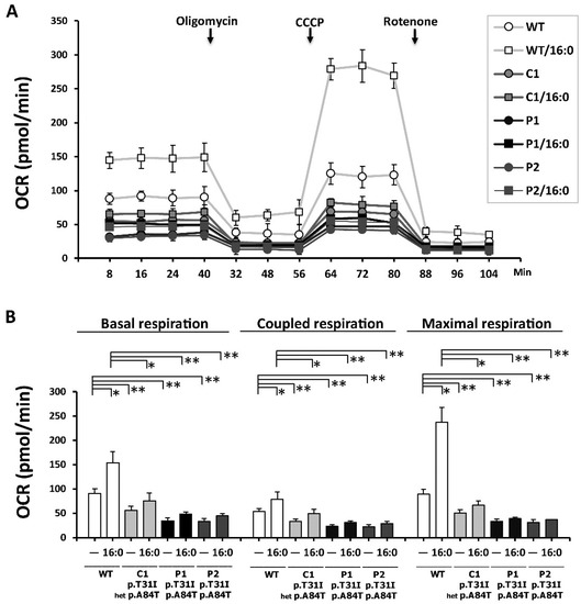 In Figure 5, mitochondrial respiration and bioenergetics is represented as the time course change of the OCR under basal conditions followed by the sequential addition of oligomycin (3 μg/mL), carbonylcyanide m-chlorophenylhydrazone (CCCP) (1 μM), and rotenone (3 μM). The progress curve is annotated to show the relative contribution of basal respiration, coupled mitochondrial respiration (OCR change between the basal condition and the addition of oligomycin) and maximal respiration (OCR change between the addition of CCCP and rotenone). The time-dependent OCR progress curves of WT, C1, P1, and P2 cells are shown in Figure 5A. Significantly lower basal respiration, coupled respiration (ATP-related respiration), and maximal respiration were found in C1, P1, and P2 cells compared with WT cells. A remarkable increase in maximal respiration was found in WT cells treated with palmitic acid. However, only a slight increase in basal, coupled, and maximal respiration occurred in the C1, P1, and P2 cells treated with palmitic acid (Figure 5B).