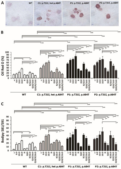 3.8. Both the c.250G>A and c.92C>T ETFDH Variants Induced the Intracellular Accumulation of Neutral Lipid Droplets