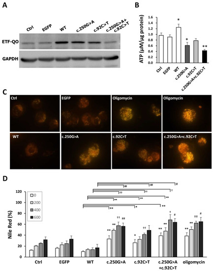 In the carrier-derived C1 cells that harbored the c.250G>A heterozygous and c.92C>T homozygous mutations, there was less than 31% protein expression and a 5.42-fold increase in neutral lipid droplet formation. The C1 cells also had an affected fatty acid metabolism and mitochondrial dysfunction even though the c.92C>T variant has not been considered to be pathogenic [39]. To functionally characterize these mutations, we established ETFDH-mutated cells transfected with plasmids containing the c.92C>T, c.250G>A, or c.92C>T + c.250G>A mutation. A significant ATP dissipation and lipid droplet accumulation was found in the transfected ETFDH mutant cells. However, the ATP level cannot be directly referred to the mitochondrial function and the oximetry analysis of each mutant clone should be addressed in the future. According to our model, a significantly increase in Nile Red-positive lipid droplets was revealed in lymphoblasts overexpressing c.92C>T. In addition, the highest amount of Nile Red-positive lipid droplets was detected in the lymphoblasts with c.250G>A + c.92C>T mutations. Therefore, we concluded that the c.92C>T variant, despite previously been noted as a neutral mutation, have pathological effects.
