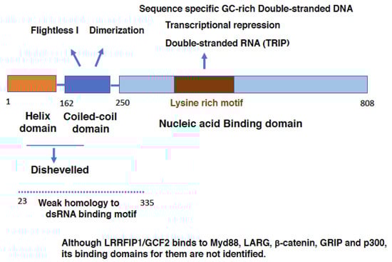 LRRFIP1/GCF2 protein consists of three domains (Figure 1); an N-terminal Helix domain, a central coiled-coil domain and a C-terminal Nucleic acid binding domain. The coiled-coil domain is necessary for the interactions with Fli-1 and for self-dimerization [,]. The Nucleic acid binding domain binds to DNAs and RNAs, and the middle of this domain, which is called as Lysine rich motif, is crucial for sequence-specific binding to the double-stranded GC-rich DNA (dsDNA) element and for transcriptional repression []. Moreover, it is and required for LRRFIP1/GCF2 protein to bind to dsRNA, TRIP [].