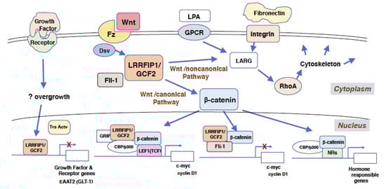 LRRFIP1/GCF2 protein works as a co-stimulator for signals from the cell surface, triggered by molecules such as Wnt, hormones, and extracellular matrix. In the Wnt/canonical pathway which is dependent on β-catenin, Wnt binds its cell surface receptor, Frizzled, and the signal is relayed to Dsv [,]. LRRFIP1/GCF2 interacts with Dsv and β-catenin, and the signal is further transduced to the nucleus. LRRFIP1/GCF2 enhances the interactions of β-catenin with transcriptional activators, such as lymphocyte enhancer binding factor 1/T cell factor (LEF1/TCF), and with a coactivator creb-binding protein (CBP)/p300 in the nucleus. LRRFIP1/GCF2 is strongly synergistic with CBP/p300, and this functional synergy is disrupted by Fli-1, indicating that LRRFIP1/GCF2 stimulates the Wnt/canonical signaling pathway, while Fli-1 counteracts and inhibits this β-catenin dependent pathway [,].