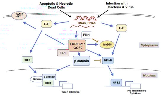 Cerebral ischemia causes the death of nerve and glial cells which release proteins, glycans, and nucleic acids. Some of these molecules, including DNAs and RNAs, activate β-catenin and TLRs signaling pathways as ligands to LRRFIP1/GCF2 and TLRs. The activated TLRs pathways induce through NF-κB pro-inflammatory cytokines, which cause worsening of brain stroke []. Treatments with antagonists to TLRs, such as TAK424 or MicroRNA-1906, were shown to protect brain ischemia [,]. Interestingly, pre-treatments with TLR agonist, such as LPS, also protected cerebral ischemia by induction of the inhibitors of inflammation, a phenomenon called as ischemic tolerance or preconditioning [,,,]. These results indicate that there is an association between immune and neurological systems through LRRFIP1/GCF2, β-catenin and TLRs.