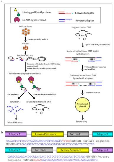 Preparation of extrachromosomal single-stranded linear microDNAs and microRNAs. (a) The single-stranded linear DNAs were pulled down by the RecAf protein. RNAs and single-stranded linear (SSL) DNAs were isolated through pulldown system based on RecAf protein. microRNA array analysis was performed with the RNA samples. Following ligation with two adaptors, the single-stranded linear DNAs libraries were constructed and sequenced. (b) The composition of adaptor A and adaptor B. Adaptors composed of end markers and random bases. N represents a random base. TTTGC and GCAAA were end markers in adaptor A or B. Ni-NTA.