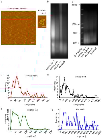 Identification of single-stranded linear extrachromosomal microDNAs. (a) Analysis of mouse heart nucleic single-stranded extrachromosomal DNA by atomic force microscopy. A 2982 bp double-stranded plasmid was used as a control. Bar = 200 nm. (b) Analysis of single-stranded extrachromosomal DNA by agarose electrophoresis. (c) Library amplification of single-stranded extrachromosomal DNA from mouse hearts (MHSSLmicroDNA), mouse brains (MBSSLmicroDNA), HeLaSSLmicroDNA and 293SSLmicroDNA, respectively. d-g, Analysis of the length distribution of SSLmicroDNAs from mouse hearts (d), mouse brain (e), HEK293 cells (f) and HeLa cells (g), respectively.