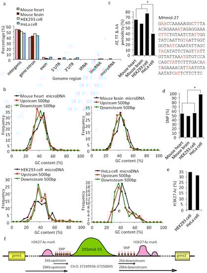 Properties of SSLmicroDNA sequences and their genomic loci. (a) Genome mapping of SSLmicroDNAs from mouse hearts, mouse brains, HEK293 cells and HeLa cells. (b) GC content of SSLmicroDNAs and their 500 bp-upstream and 500 bp-downstream regions. (c) Analysis of AT, TT or AA periodicity of SSLmicroDNA sequences from mouse hearts, mouse brains, HEK293 cells and HeLa cells. The MHmid-27 sequence periodically separated by AT, TT or AA is presented. * p < 0.05. (d) Analysis of single nucleotide polymorphism sites (SNPs). The data are the percentages of microDNA loci with SNPs within 2kb upstream or downstream. * p < 0.05. (e) Analysis of H3K27 Ac marks within 2 kb-upstream or -downstream regions of SSLmicroDNAs genomic loci. The data are the percentages of microDNA loci that have H3K27 Ac marks within the indicated regions. (f) A glance at the scenery near 293mid-55 in the genome.