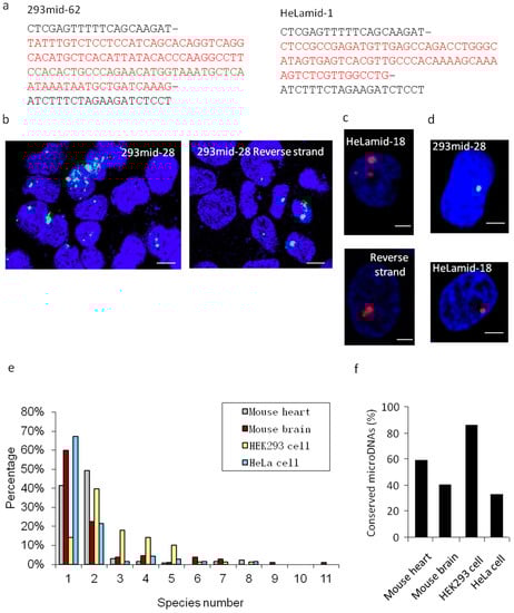 Determination of microDNA subcellular localization and conservation level. (a) The sequencing data of 293mid-62 and HeLamid-1 in the detection of endogenous linear microDNAs. The 293mid-62 probe with a biotin tag at the 5′-end was transfected into HEK293 cells, and HeLamid-1 probe with a biotin tag at the 5′-end was transfected into HeLa cells. Then the pulldown system based on interaction between biotin and streptavidin was performed and the 293mid-62 and HeLamid-1 were detected by sequencing. (b,c) Detection of SSLmicroDNA subcellular localization. HEK293 cells were transfected with 293mid-28 or its reverse strands labeled with a FAM at the 5′-end (b), and HeLa cells were transfected with HeLamid-18 or its reverse strands labeled with a TAMRA at the 5′-end (c). The nuclei were stained by DAPI (the dark blue area). The light blue dots represented 293mid-28 or its reverse strands. The red dots represented HeLamid-18 or its reverse strands. The Bar = 10 μm. (d) Fluorescence in situ hybridization (FISH) analysis of SSLmicroDNA localization in cell nucleus. 293mid-28 was detected by its probes labeled with FAM at the 5′-end in HEK293 cell nucleus. HeLamid-18 was detected by its probes labeled with TAMRA at the 5′-end in HeLa cell nuclei. The nuclei were stained by DAPI (the dark blue area). The light blue dots represented 293mid-28. The red dots represented HeLamid-18. Bar = 20 μm. (e) Analysis of the conservation level of SSLmicroDNA sequences. Species number represents the number of species in which SSLmicroDNAs were conserved. f, Summary of the conservation level of SSLmicroDNAs. The SSLmicroDNAs that were conserved in more than one species were counted.