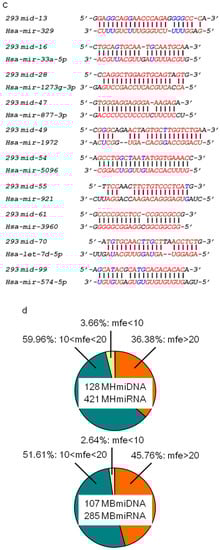 Many miRNAs are distributed in nuclei, where they can regulate chromatin remodeling, transcriptional silencing, mRNA alternative splicing, and microRNA maturation [,,,]. The abundance of SSLmicroDNAs in the nuclei of normal tissues and cells suggested a potential participation in microRNA regulatory pathways. Therefore, we studied the interaction between microDNAs and microRNAs. MicroRNAs were extracted from the nuclear pull-down product via the single-stranded DNA binding protein RecAf and analyzed using microRNA arrays. MicroRNA arrays identified 421 mouse heart (Table S1), 285 mouse brain (Table S2), and 1101 HEK293 microRNAs (Table S3). We analyzed all of the microRNA and SSLmicroDNA sequences using the bioinformatics program RNAhybrid. The results showed that microDNAs pair well to at least one microRNA (Figure 5a–c, and Supplementary Figures S4–S6). Among all the microDNA–microRNA sequence alignments, we detected ~45.76% hybridization with more than 20 kcal/mol free energy in the mouse brain library, and 36.38% in the mouse heart library (Figure 5d). Furthermore, 24.41% of the hybridizations between microDNAs and microRNAs in mouse hearts, 28.97% in mouse brains, and 27.27% in HEK293 cells exhibited more than 6 bp-continuous base pairing at microRNA seed regions. At any given location, 10 bp-continuous base pairing appeared in 56.69% of the hybridizations in the mouse heart, 58.88% in mouse brains, and 66.23% in HEK293 cells (Figure 5e). The microRNAs seed region is a critical recognition and functional site for targeting to mRNAs []. Therefore, we hypothesized that this was also a site for microDNAs interaction with microRNAs in the cell’s nucleus. To validate this hypothesis, we performed pull-down experiments, and showed that mir-1273g-3p was pulled down by the 293mid-28, and mir-5096 was pulled down by the 293mid-54, which was both interrupted by the mutation in the predicted target region of microDNA (Figure 5f). Taken together, these data indicate that SSLmicroDNAs likely interact with microRNAs in nuclei.