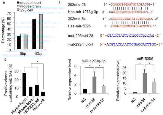Interaction between microDNAs and microRNAs. (a–c) Sequence alignments between SSLmicroDNAs and microRNAs in HEK293 cells (a), mouse hearts (b) and mouse brains (c) were analyzed using the bioinformatics program RNAhybrid. (d) Analysis of the free energy (mfe) in microDNA-microRNA alignments. The unit of energy was –kcal/mol. (e) Analysis of the microDNA-microRNA sequence alignment. 6 bp represented 6 bp- or more than 6 bp-continuous pairing in the seed region of microRNAs. 10 bp represented 10 bp- or more than 10 bp-continuous pairing in microRNAs. (f) Detection of the interaction between microDNAs and microRNAs in cell nucleus. The upper panel showed the sequence alignment we predicted between 293mid-28 and hsa-mir-1273g-3p, as well as 293mid-54 and hsa-mir-5096. The middle panel showed the mutant sequence region in 293mid-28 and 293mid-54. HEK293 cells were transfected with biotinylated 293mid-28 or negative control RNA (NC) or mutant 293mid-28 and then performed with the pulldown system based on interaction between biotin and streptavidin. The levels of miR-1273g-3p were detected by qRT-PCR in the pulldown product. n = 3, * p < 0.05 vs. NC. The combination of 293mid-54 and miR-5096 was analyzed similarly to that of 293mid-28. (g) Analysis of SSLmicroDNA yield. The rates of SSLmicroDNA-positive clones relative to the total number of clones during purification were counted. * p < 0.05.