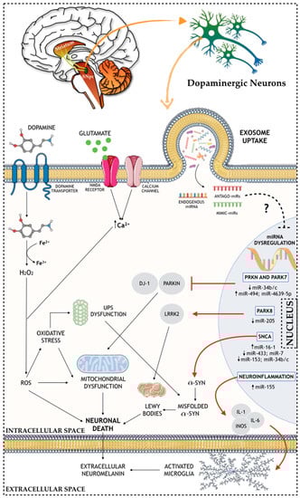 Schematic representation of the role of miRNAs in the molecular and cellular (e.g. nuclear, intracellular, and extracellular) mechanisms of PD brain.