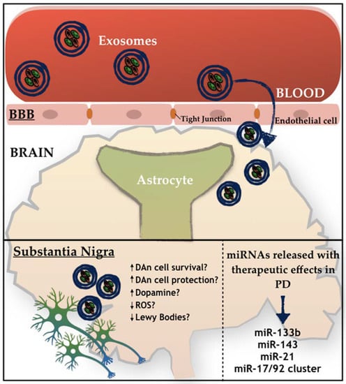 In addition to this involvement in PD pathophysiology, miRNAs are also being investigated as a potential source of PD biomarkers, in which the exosomes are being identified as a great use for diagnosis and prognosis of the disease. Indeed, Vizoso and colleagues [] have recently proposed that MSCs-derived secretome is sufficient to significantly improve multiple biomarkers of the pathophysiology, making it a potential strategy to be used for the establishment and identification of promising PD biomarkers. As we have previously described, MSCs are able to secrete large quantities of exosomes carrying miRNAs, and such miRNAs may function not only as a novel class of promising biomarkers, but as modulators of multiple systems that could play critical roles in several diseases, including PD. Therefore, the possibility of using it as a potential therapeutic strategy for the treatment of PD is starting to emerge. To target the brain areas affected in PD, miRNAs must be delivered into the brain through a transport system able to cross the BBB—Figure 2. Due to the multi-faceted nature of exosomes, its application in clinics is something that could be envisaged in the near future []. However, firstly, some challenges need to be addressed, namely: (1) The correct (MSC) cell line; (2) exploration of the most efficient and reliable yield isolation technique associated to an efficient scalable production; (3) development of robust loading methods without damage to the exosomal integrity, in order to ensure an improved insight into PD cellular and molecular mechanisms, and finally to (4) address and plan possible strategies to improve (MSCs) exosomes’ targeting capability.